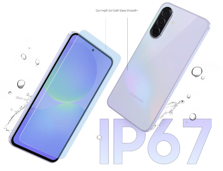 Corning® Gorilla® Glass Victus®+ mentine designul admirabil al Galaxy A36 5G la un nivel grozav. In plus, cu protectie IP67, noua serie Galaxy A este ferita de murdarie si stropire.