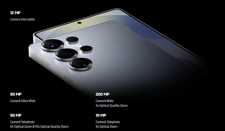 200 MP, f/1.7, 24mm (wide), 1/1.3", 0.6µm, multi-directional PDAF, OIS 10 MP, f/2.4, 67mm (telephoto), 1/3.52", 1.12µm, PDAF, OIS, 3x optical zoom 50 MP, f/3.4, 111mm (periscope telephoto), 1/2.52", 0.7µm, PDAF, OIS, 5x optical zoom 50 MP, f/2.0, 13mm, 120˚ (ultrawide), 0.7µm, dual pixel PDAF, Super Steady video Camera frontala: 12 MP, f/2.2, 26mm (wide), dual pixel PDAF |